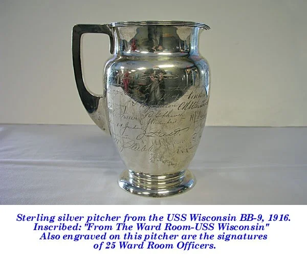 It’s funny how things happen. In May, 2002, I noted an entry in the guest log of our world-famous website from a woman in Ishpeming, a small city in the upper peninsula of Michigan. Her name was Judy Conrad and it seems that she had purchased some items at an estate sale in the nearby city of Marquette. One of the items was a sterling silver pitcher inscribed: “From The Ward Room Mess – USS Wisconsin”. It also bore the engraved (etched) signatures of 25 of the Ward Room Officers! She had tracked down its history and learned that it was from the first USS Wisconsin (BB-9), which had been scrapped in 1922. Coincidently, the pitcher had been created by the Gorham Silver Company, who had also created the beautiful silver service which is a part of the history of both ships and is proudly displayed at Nauticus!
