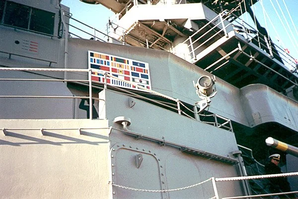 Dark blue and gold are the colors traditionally associated with the United States Navy. The ship’s wheel represents navigation and leadership and reflects WISCONSIN’S global capabilities and seaworthiness. The smaller shield, from the United States Coat of Arms points out our national heritage and also appears on the Wisconsin State Flag. During World War II WISCONSIN played a vital part in the attainment of U.S. Naval power as second to none in the world. She earned 5 battle stars for her World War II service and one for Korea. This total is represented by the stars around the ship’s wheel.