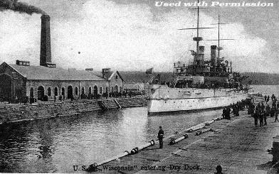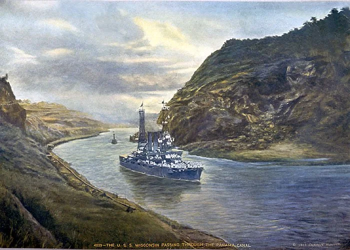 -Sent in by Dave Patrykus. USS Wisconsin BB-9, passing through the Panama Canal. This was in a 1917 calendar.