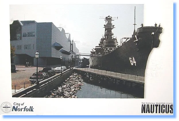 On August 17, 1999, the City of Norfolk was elated to learn that the Navy approved the berthing of the USS WISCONSIN at the National Maritime Center – Nauticus. To quote the Virginia Pilot “the basin beside Nauticus will have to be dug out as much as 15 feet deeper, removing about 185,000 cubic yards of river bottom. That’s enough to cover a football field with a pile of muck 80 feet deep.” The Navy would pay an estimated $5.8 million for the dredging and moving of the ship to its new home. The below photo is a mockup of what the waterfront would look like with the Wisconsin berthed at the Nauticus and two artist renderings of the final project.