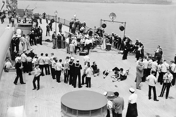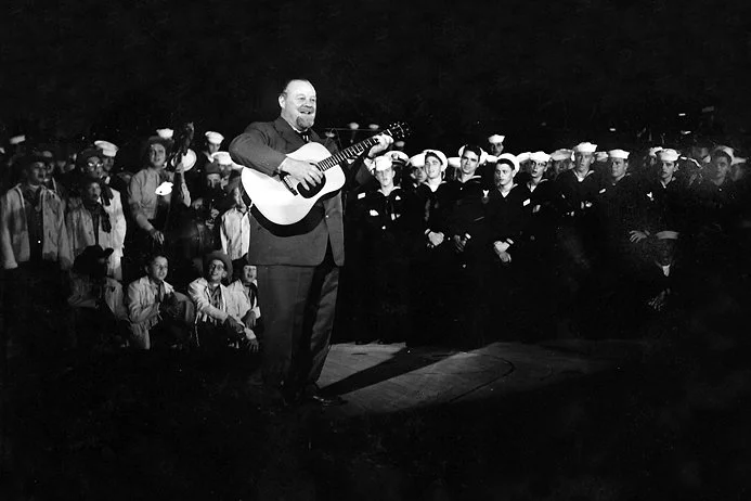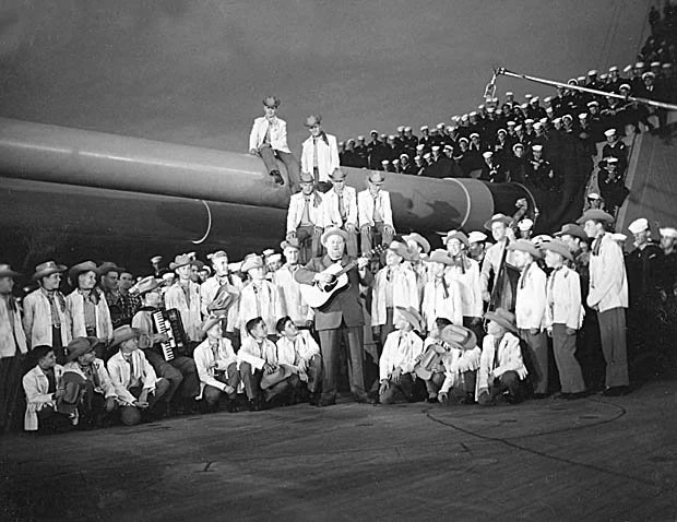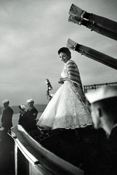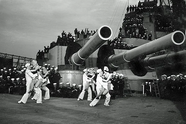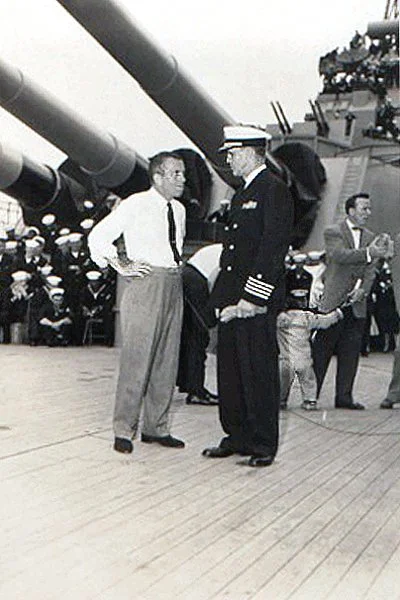 Ed Sullivan broadcast his show, “Toast of the Town” from the USS Wisconsin on May 22nd, 1955 while it was docked in New York Harbor. He performed with Peg Leg Bates, comedian “Fat Jack” E. Leonard, June Valli, and Burl Ives. In addition, the Arizona Boys Choir, comedian Richard Hearnes (known as “Mr. Pastry”), the Balladinis, the Marine Drill Team and the band of the USS Wisconsin.
