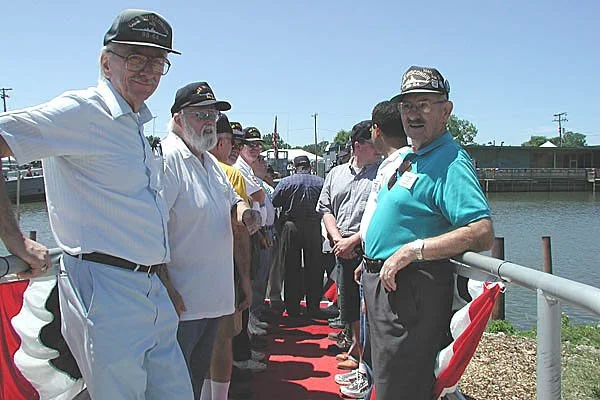 Each former crewmember came up to the podium, gave his name and hometown, and was then presented with a pin from the City of Mentor. It was now time to raise the flags on the whaleboat. 13 of us were selected to go on board and the rest of our crew lined up as side boys on the gangway. The Mayor presented the colors to Carl, who together with Mike Bowers raised the American Flag (#70) The Mayor then presented Carl with the Navy Flag who passed it on to John Fox (#71). An announcement was made to bring the BB-64 to life. It is registered with the Coast Guard as BB-64 (#54), All whistles and horns were blown in celebration of this recommissioning. The lines were cast off and we were taken for another short spin around the Lagoon. Once again, Mike Bowers (#74) and Rich Frankenbery took turns at the wheel. We docked and we were now on our own to have fun.