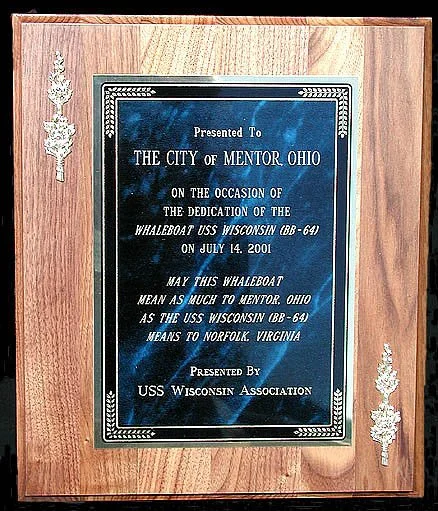 Next came the recommissioning ceremonies. Welcoming speeches were made by the Vice-Mayor, Robert Shiner, who then introduced Mayor Edward Walsh, City Manager, Julian Suso, and LCDR. James Collins. After all the introductions and speeches, I gave a brief rundown on the history of our ship from the time congress approved construction up to her being berthed at Hampton Roads Naval Museum and the National Maritime Center-Nauticus. Carl Capestrain, our President, followed with his comments about our ship. He explained that this whaleboat was the child of the Wisconsin and he hoped that the BB-64 whaleboat would do for the City of Mentor what the USS Wisconsin has done for the City of Norfolk. Then on behalf of the USS Wisconsin Association, he presented the City of Mentor with a plaque with this inscription (#65).